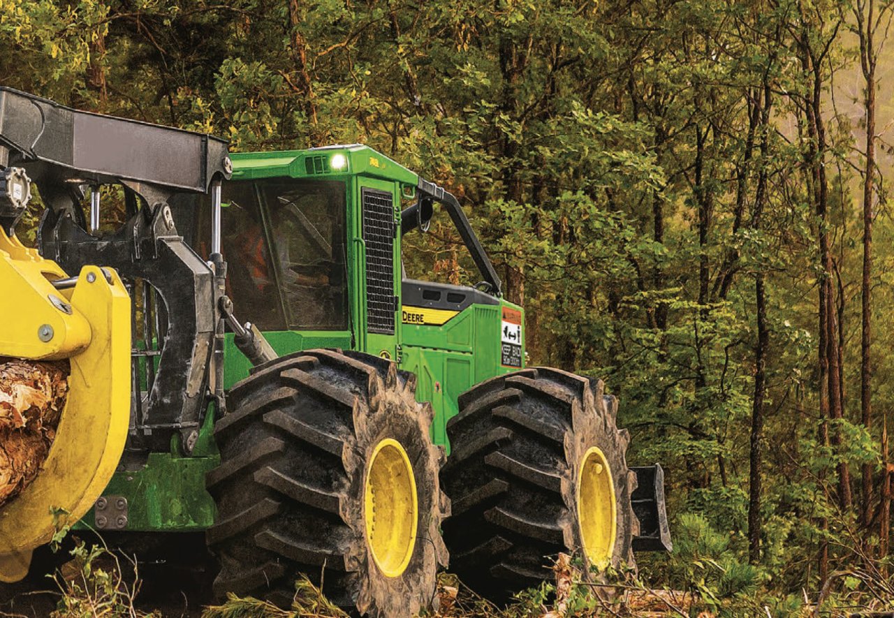 Speciální lesní kolový traktor John Deere s dvoučinným drapákem a navijákem